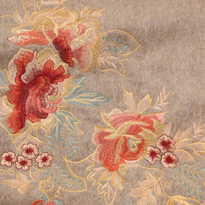 This three-dimensional embroidered cashmere scarf is crafted with delicate cashmere material, showcasing meticulous hand embroidery that brings each flower to life with stunning realism. The intricate craftsmanship creates a three-dimensional effect, lending the scarf texture and vibrant depth. Its warm, soft fabric combined with exquisite embroidery makes it a unique and elegant accessory, perfect for complementing everyday wear or adding a touch of distinction to special occasions.