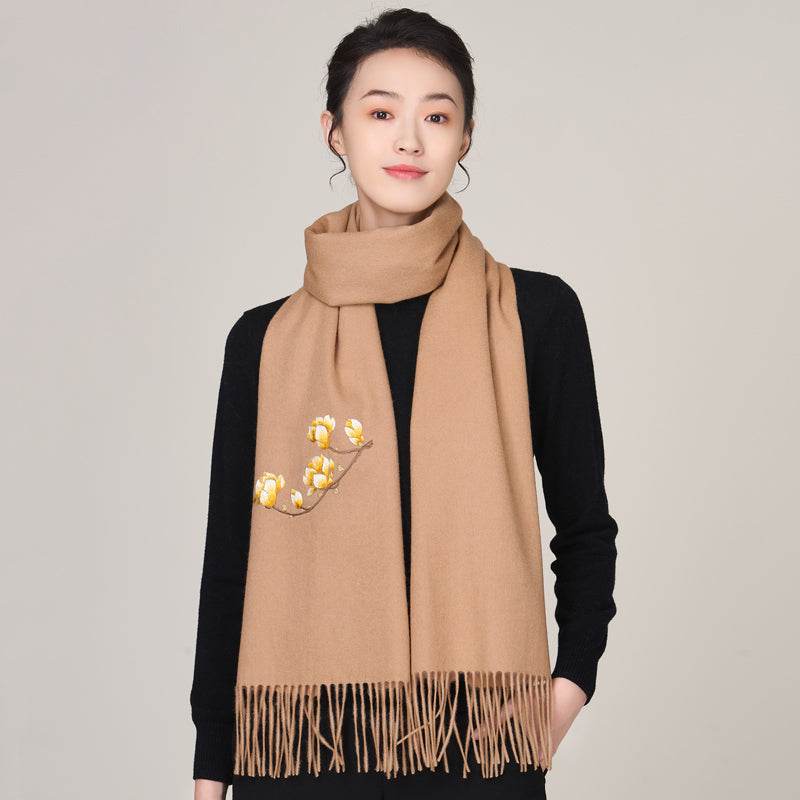 Handmade Suzhou Embroidery Wool Cashmere Scarf with Magnolia Flower 200x38cm