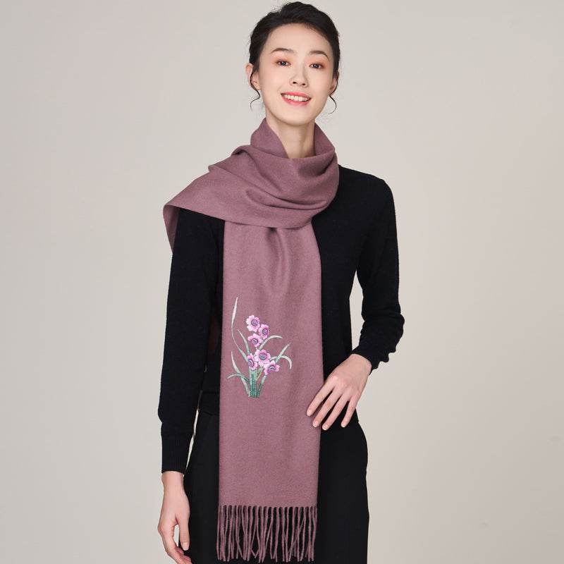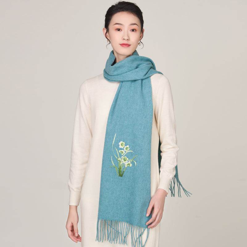 Handmade Suzhou Embroidery Wool Cashmere Scarf with Narcissus Flower 200x38cm